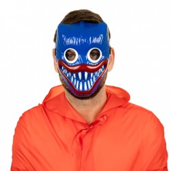 Maska niebieskiego potwora w wielkimi białymi kłami i kontrastującymi czerwonymi wargami. Okrągłe oczy dopełniają potworny wizerunek. Maska Zęby to doskonała propozycja na Halloween.